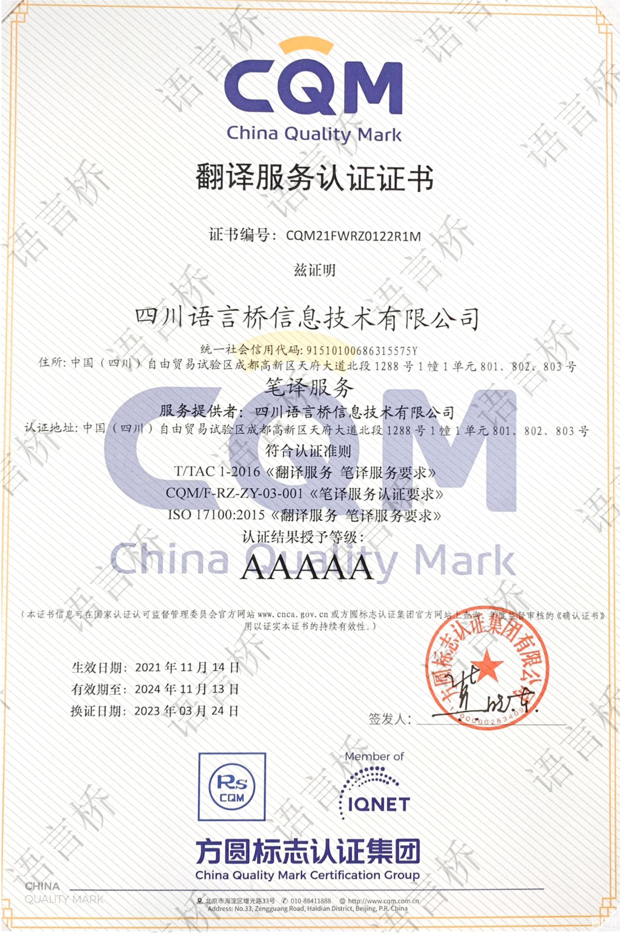 為創(chuàng)新推動翻譯行業(yè)標(biāo)準(zhǔn)化的建設(shè),為創(chuàng)新推動翻譯行業(yè)標(biāo)準(zhǔn)化建設(shè),中國翻譯協(xié)會依托已發(fā)布的標(biāo)準(zhǔn)、行業(yè)規(guī)范,與專業(yè)認(rèn)證機(jī)構(gòu)共同制定了《筆譯服務(wù)認(rèn)證規(guī)范》,并由第三方認(rèn)證機(jī)構(gòu)方圓標(biāo)志認(rèn)證集團(tuán)對翻譯及語言服務(wù)企業(yè)實(shí)施認(rèn)證工作,通過對翻譯企業(yè)提供的筆譯服務(wù)質(zhì)量管理能力和翻譯服務(wù)水平進(jìn)行評價,證明翻譯企業(yè)的筆譯翻譯服務(wù)滿足國際標(biāo)準(zhǔn)ISO 17100-2015《翻譯服務(wù) 筆譯服務(wù)要求》、中國譯協(xié)標(biāo)準(zhǔn)T/TAC 1-2016《翻譯服務(wù) 筆譯服務(wù)要求》和方圓標(biāo)志認(rèn)證集團(tuán)有限公司認(rèn)證規(guī)范CQM/F-ZY-02-001《筆譯服務(wù)要求》的要求,并達(dá)到翻譯服務(wù)水平等級(A至AAAAA)。