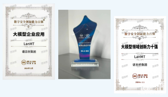 本屆創新百強由|SC平臺、大模型產業聯盟主辦,眾多政府單位領導、高校教育代表、行業專家學者、投融資機構代表、標桿企業代表等蒞臨現場,基于數字化創新浪朝下的技術發展趨勢、典型成果應用、科教融匯實踐等話題進行深入探討,并共同見證了新一屆創新百強企業的震撼出爐,擎畫創新能力全景圖譜。語言橋集團憑借自研核心產品LanMT Al翻譯模型(點擊文末"閱讀原文"體驗)在數字安全與A大模型兩大領域13大熱點賽道的近500家獲獎廠商中脫穎而出,榮獲“數字安全領域創新力十強”與“A大模型領域創新力十強”,以及360數字安全“優秀生態合作獎”。