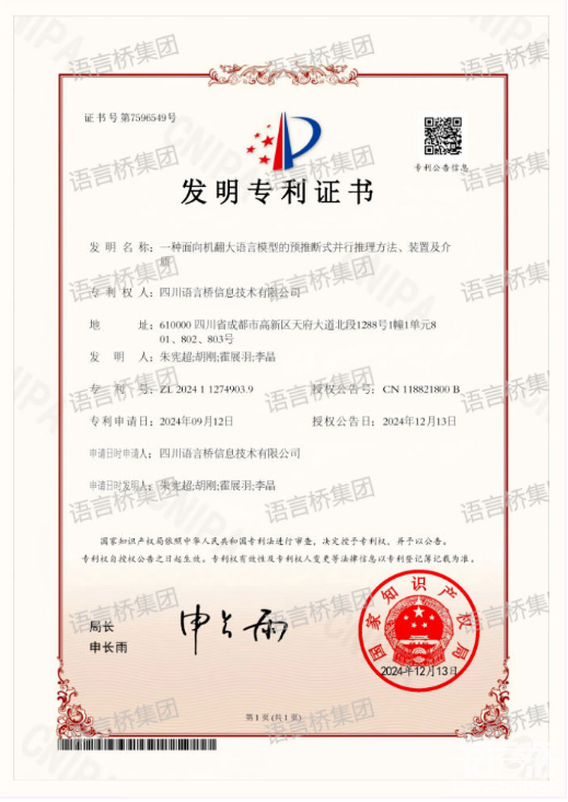 在語言的世界里,我們從未停止探索。全球化的數字時代,機器翻譯(Machine Translation,MT)已經成為連接不同語言和文化的橋梁。隨著深度學習技術的迅猛發展,大語言模型在多語言處理任務中取得了顯著的進展。然而,面對復雜多變的語言環境,如何提升模型的實時性和準確性依然面臨諸多挑戰。本月,語言橋申請的發明專利“一種面向機翻大語言模型的預推斷式并行推理方法、裝置及介質“獲得授權,該專利技術由語言橋自主研發,旨在通過引入預推斷token和并行翻譯流程來提升模型翻譯的效率和準確性。