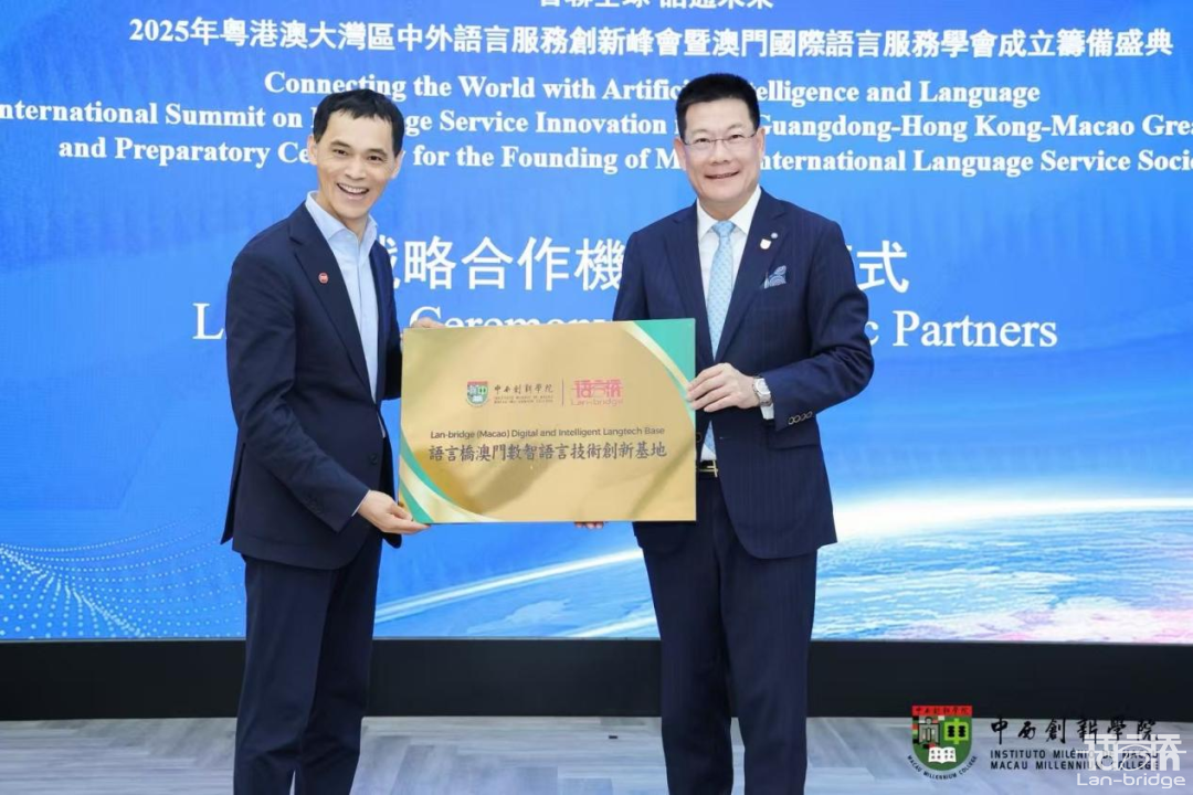 會議期間,語言橋集團與中西創新學院正式簽署戰略合作協議,標志著雙方在數智語言服務領域正式開啟了深度合作的新篇章。同時,憑借在語言技術與創新應用方面的領先實力,并獲授“語言橋澳門數智語言技術創新基地”牌匾,標志著雙方在數智語言服務領域開啟深度合作新篇章。