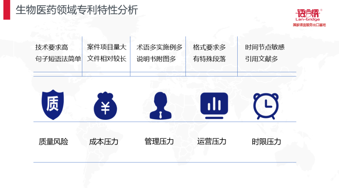 根據(jù)生物醫(yī)藥領(lǐng)域特點帶來的質(zhì)量風(fēng)險,成本壓力,管理壓力,運營壓力,時限壓力,語言橋采用了定制的譯員服務(wù)團隊,責(zé)任清晰的,高質(zhì)量,高一致性的專利翻譯服務(wù),使申請人在得到高質(zhì)量的專利翻譯服務(wù)達到降本增效的同時,也實現(xiàn)國際專利的精細化管理。