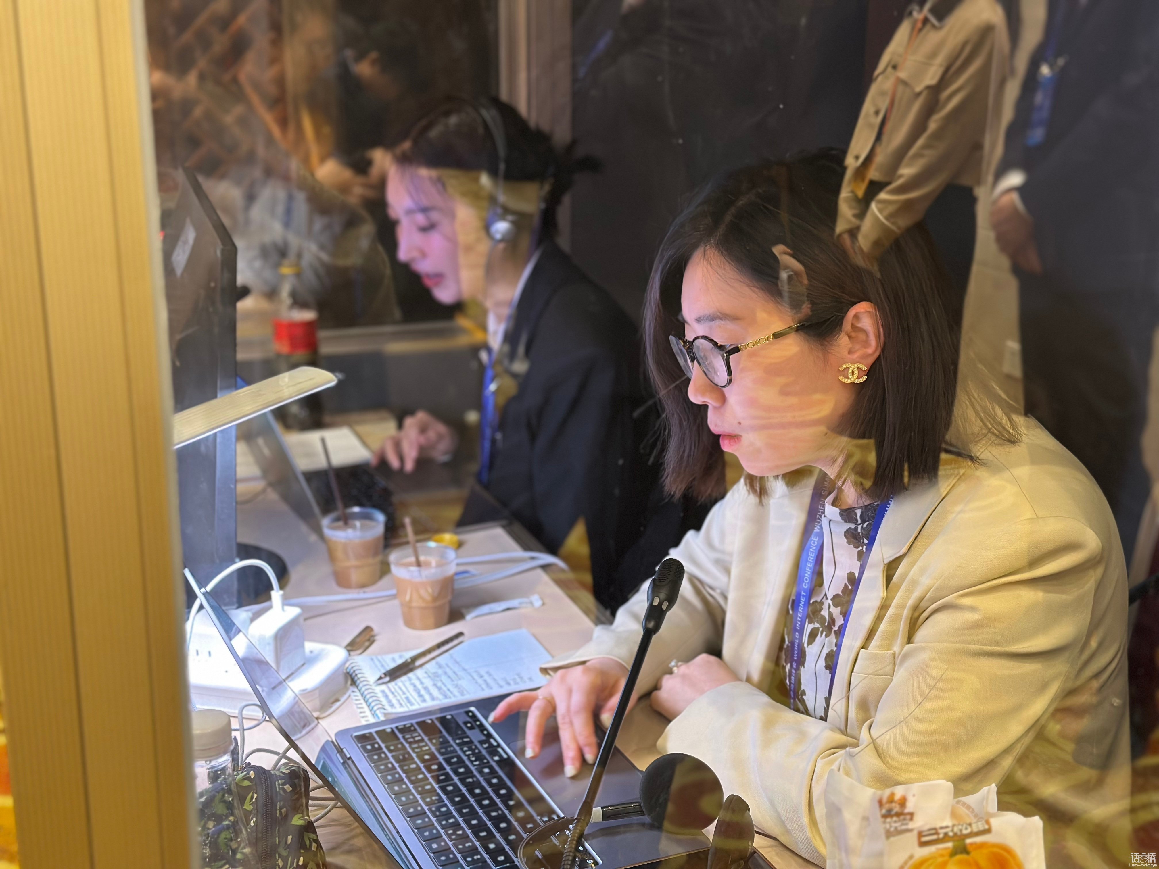 11月6日至9日會議期間,30余名譯員與速記員的配合,就像一套精密的雙重備份系統,跟會工作人員則像“系統管理員”一樣,大家穿梭在水鄉的每個角落,搭建起無形的語言基礎設施:主論壇的高階對話、多場分論壇的專業研討、“六小龍烏鎮對話”的思想碰撞……中、英、法、俄、阿五大語種同傳交傳全覆蓋。