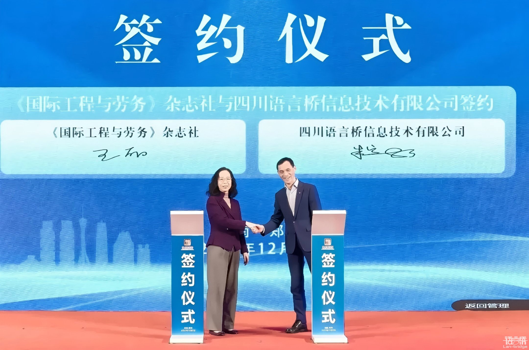 12月5日,承包商會《國際工程與勞務》雜志社與四川語言橋信息技術有限公司(簡稱語言橋)舉行戰略合作簽約儀式。雜志社社長王麗、語言橋董事長朱憲超作為雙方簽約代表,共同簽署合作協議,續寫為期五年的戰略合作新篇章。